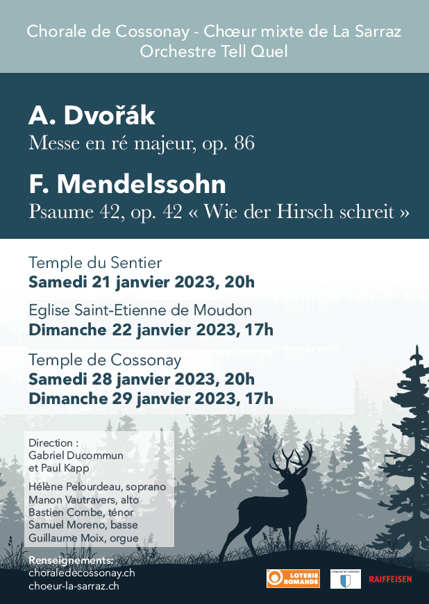 - La Messe en ré majeur, op. 86 d’Anton Dvořák (env. 45 min) pour chœur, 4 solistes et orchestre placé sous la direction de Gabriel Ducommun (directeur de la Chorale de Cossonay)